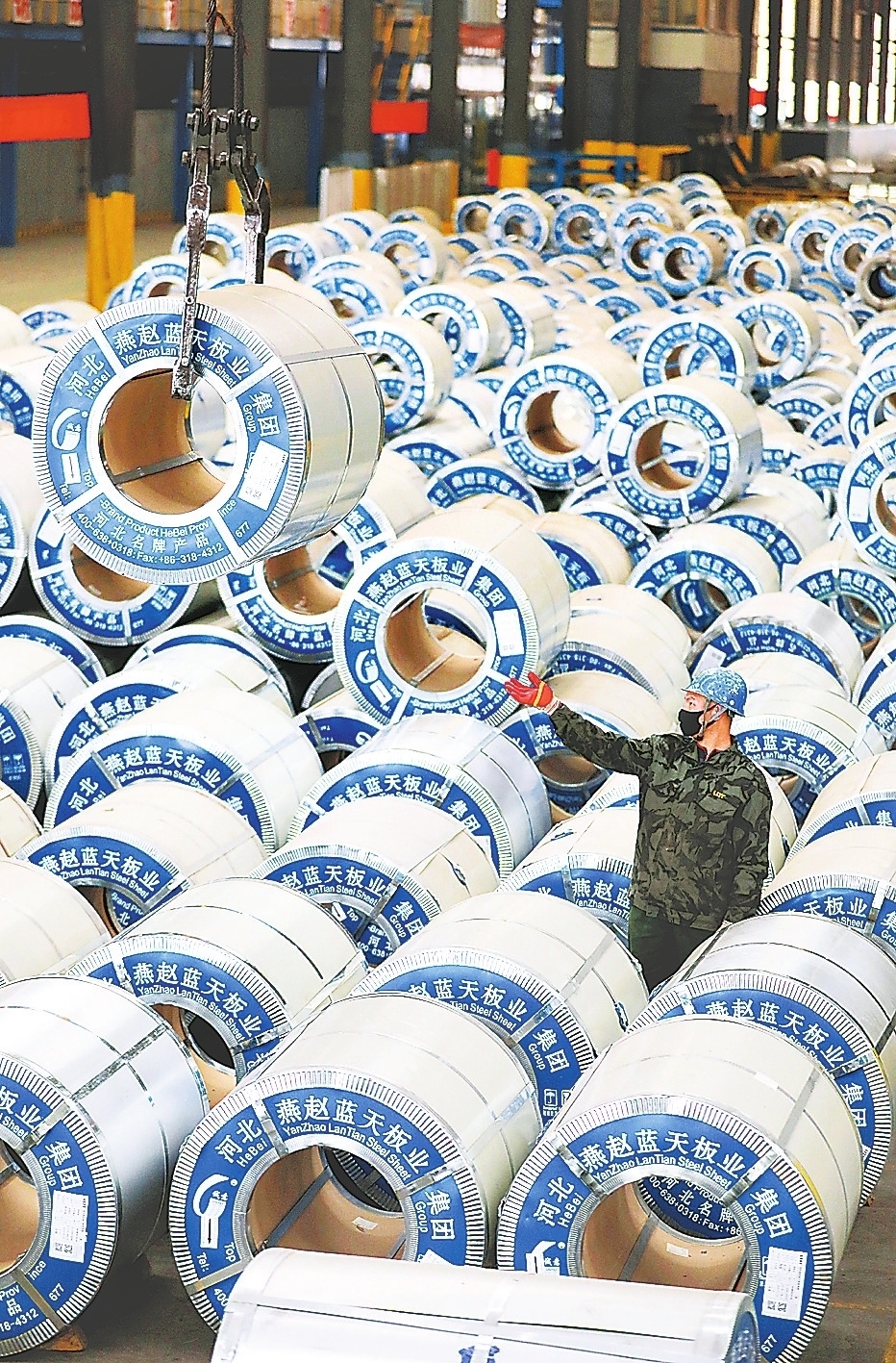 连日来,景县不断创新工作思路,一手抓疫情防控,一手抓生产发展。截至2月27日,该县共有341家企业复产复工,113家规上企业复工率达100%。图为该县河北燕赵蓝天板业集团工人正在生产车间内指挥运输成品。 陈康 摄