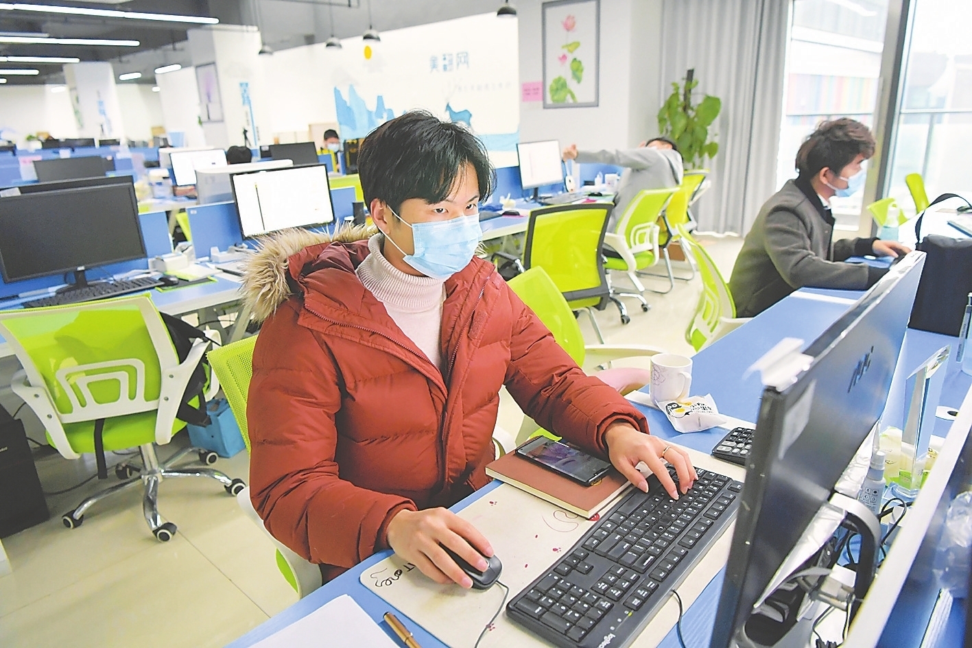 3月2日,江西省南昌市红谷滩新区慧谷产业园一家公司的员工在办公区错峰上班。