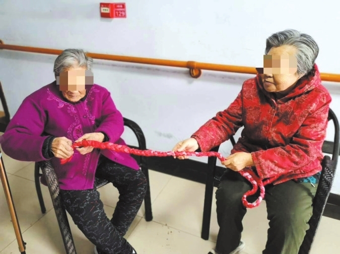 别看老奶奶90岁高龄,却是个闲不住的人。封闭这段时间把她闷坏了,总想找点“活儿”干。看着风中飘扬的红色条幅,老奶奶有了主意,扯了几条回到房间,编起了绳子。隔壁的老太太也来热心帮忙,两人一个抻,一个编,配合得天衣无缝。编出来的红色绳子还挺像那么回事。