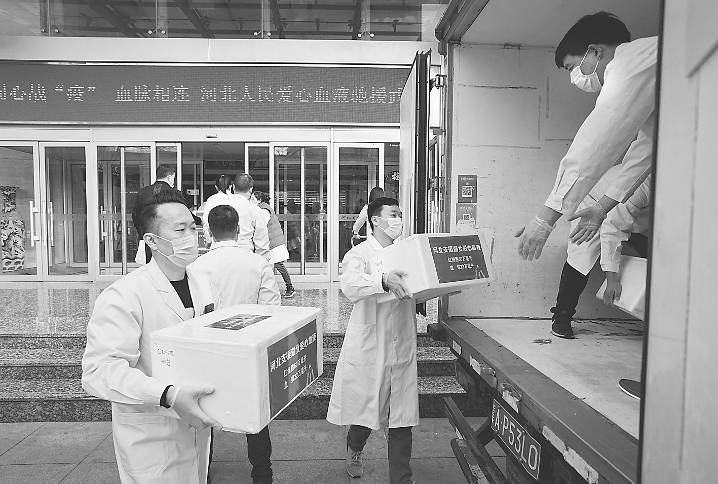 当日,由河北省卫生健康委调度的60万毫升红细胞和22万毫升血浆从河北省血液中心出发,送往湖北武汉支援抗疫一线用血。 新华社记者 牟宇 摄