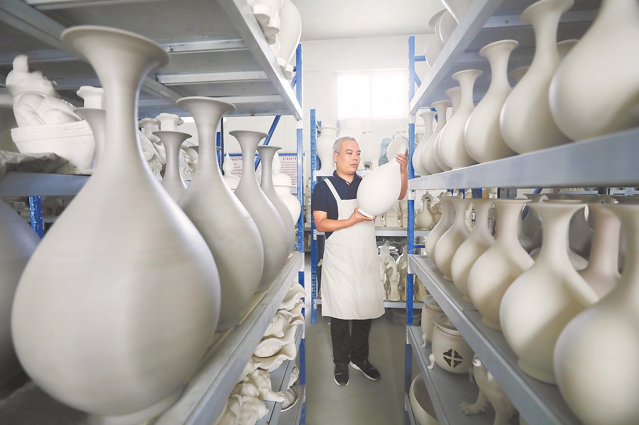 8月24日,在河南省宝丰县大营镇宣和汝瓷生产车间,汝瓷艺人王占稳在查看汝瓷素胎质量。