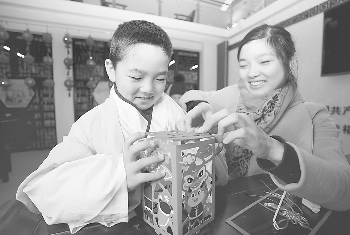1月24日,在安徽省全椒县图书馆国学大讲堂上,孩子和家长一起制作灯笼。