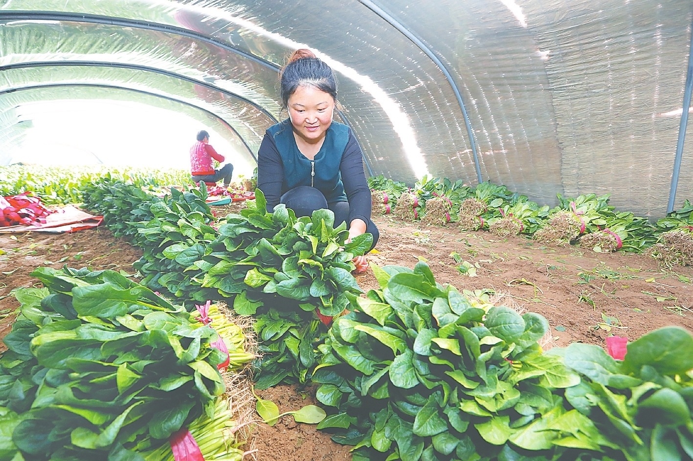 新春伊始,故城县建国镇农民在做好疫情防控的前提下,忙着抢抓农时,进行大棚作物管护、采收等,大棚内呈现出一派“忙春”图景,为丰产丰收打下基础。图为日前,建国镇许口村菜农正在收割菠菜。