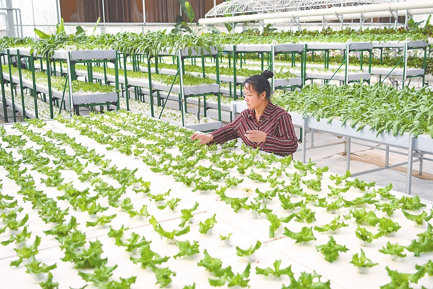2月22日,河北省河间市一家现代农业园区工人在管理无土栽培蔬菜。