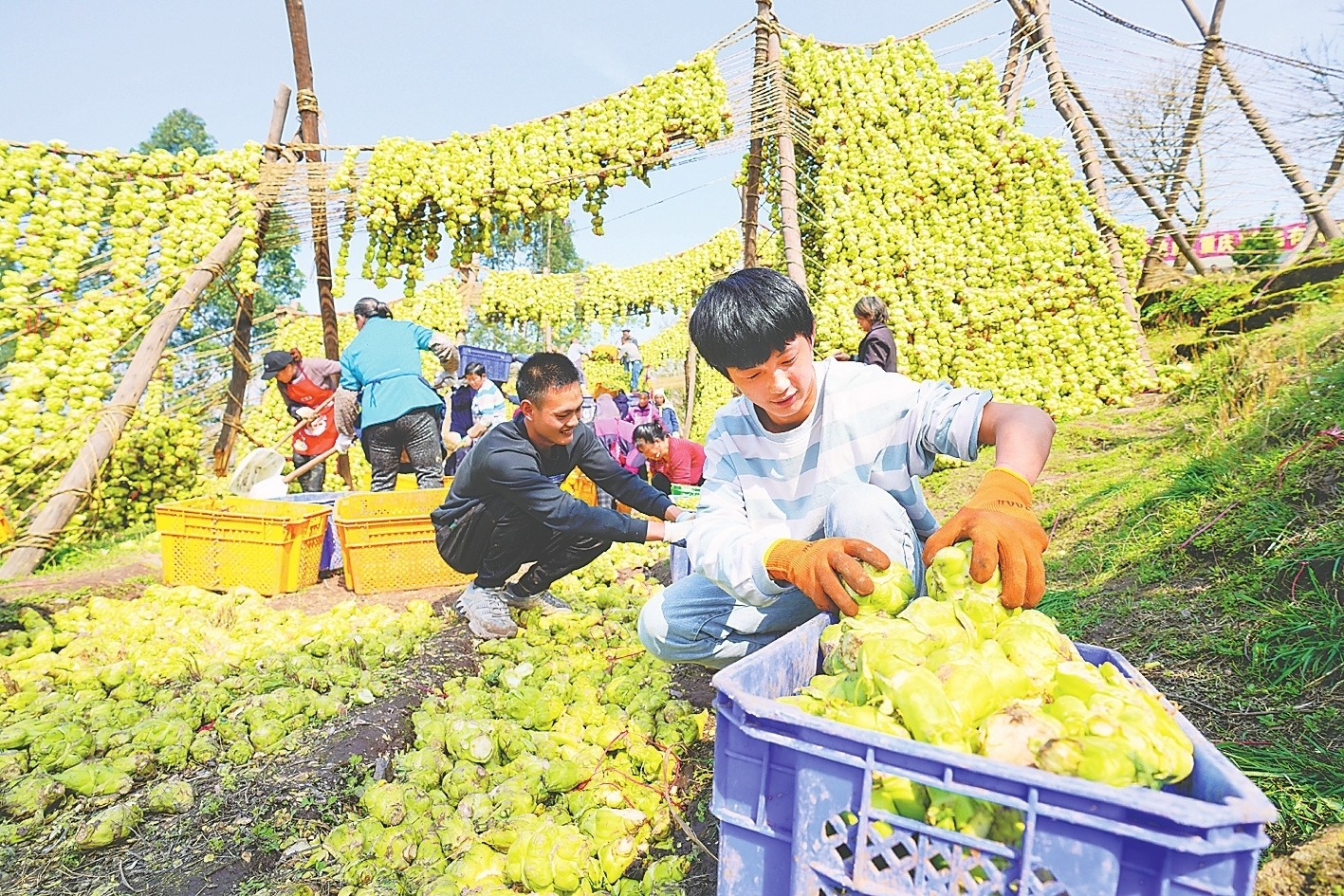 2月20日,在重庆市涪陵区马武镇一家榨菜企业的晾晒场上,工人将晾晒好的青菜头装筐。