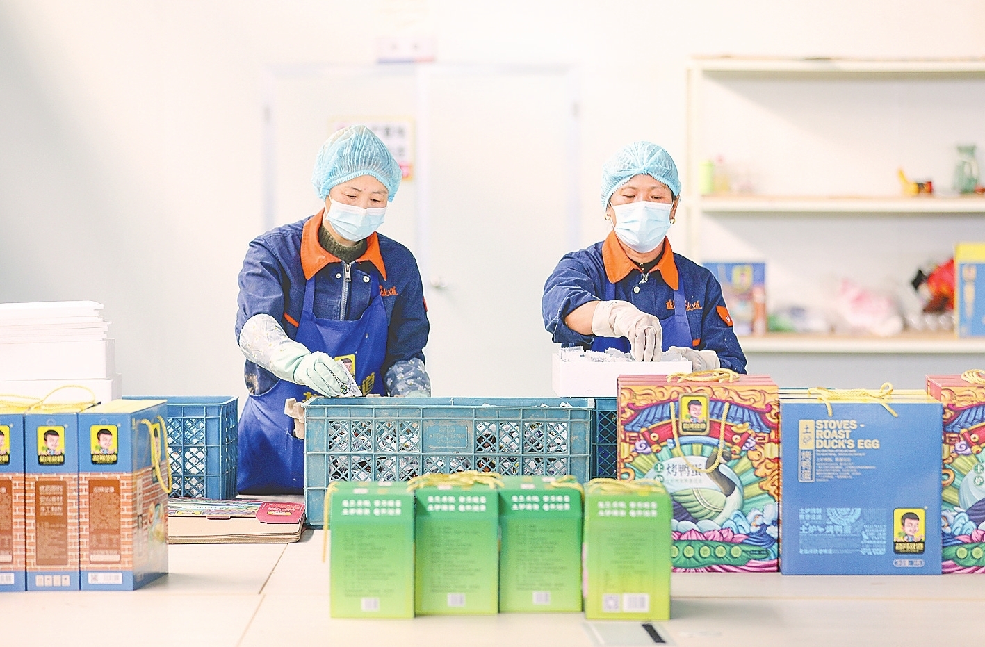 近年来,滨湖新区彭杜乡鼓励发展“传统技艺烤鸭蛋”等具有衡水湖特色的旅游商品,引导农民走上增收致富之路。目前,该乡有烤鸭蛋企业6家,从业人员近百人,鸭蛋产品远销全国二十多个省市自治区,年销量近200万公斤。图为在彭杜乡科果牧业有限公司生产车间,工作人员正在装箱。