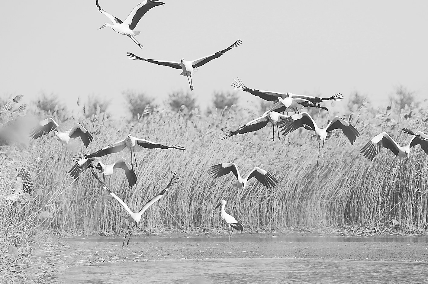 11月14日,一群东方白鹳在曹妃甸湿地飞舞。