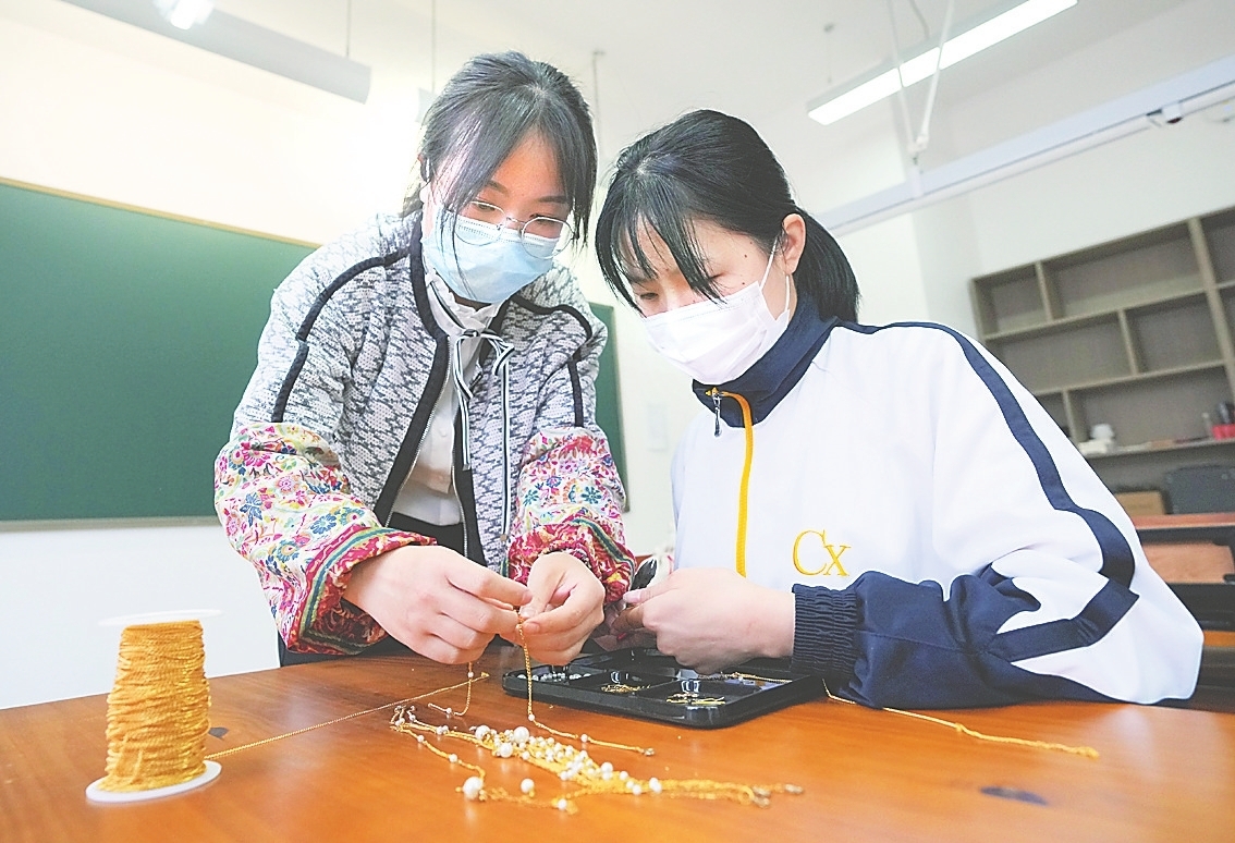 5月13日,在陕西省城市经济学校,工艺美术专业教师田蕾(左)指导听障学生学习首饰制作。