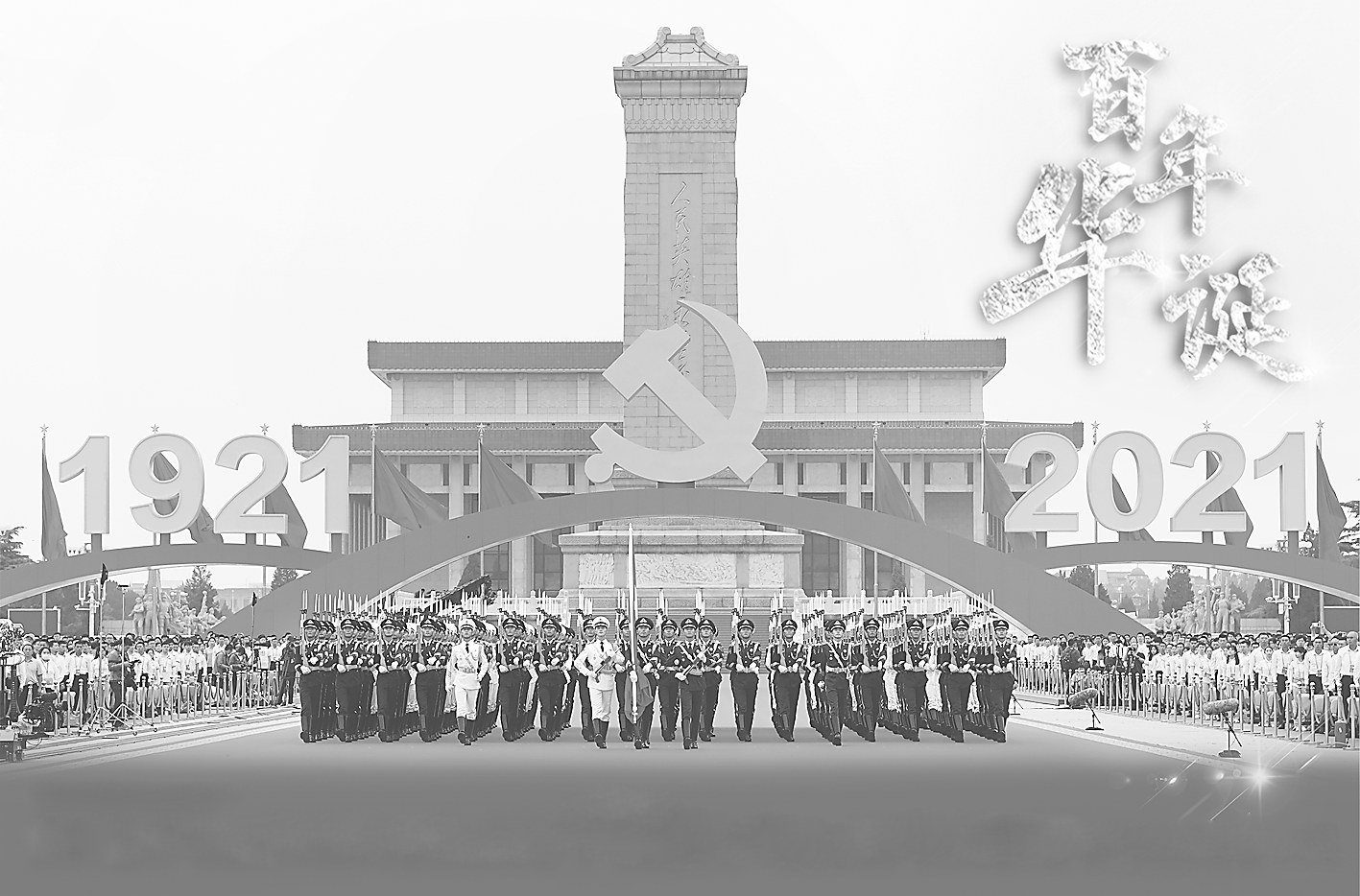 天安门城楼庄严雄伟,城楼红墙正中悬挂着毛泽东的巨幅彩色画像。天安门广场上,人民英雄纪念碑巍然矗立。纪念碑北侧,高7.1米、宽7.1米的中国共产党党徽和“1921”“2021”字标格外醒目。广场东西两侧,100面红旗迎风招展。