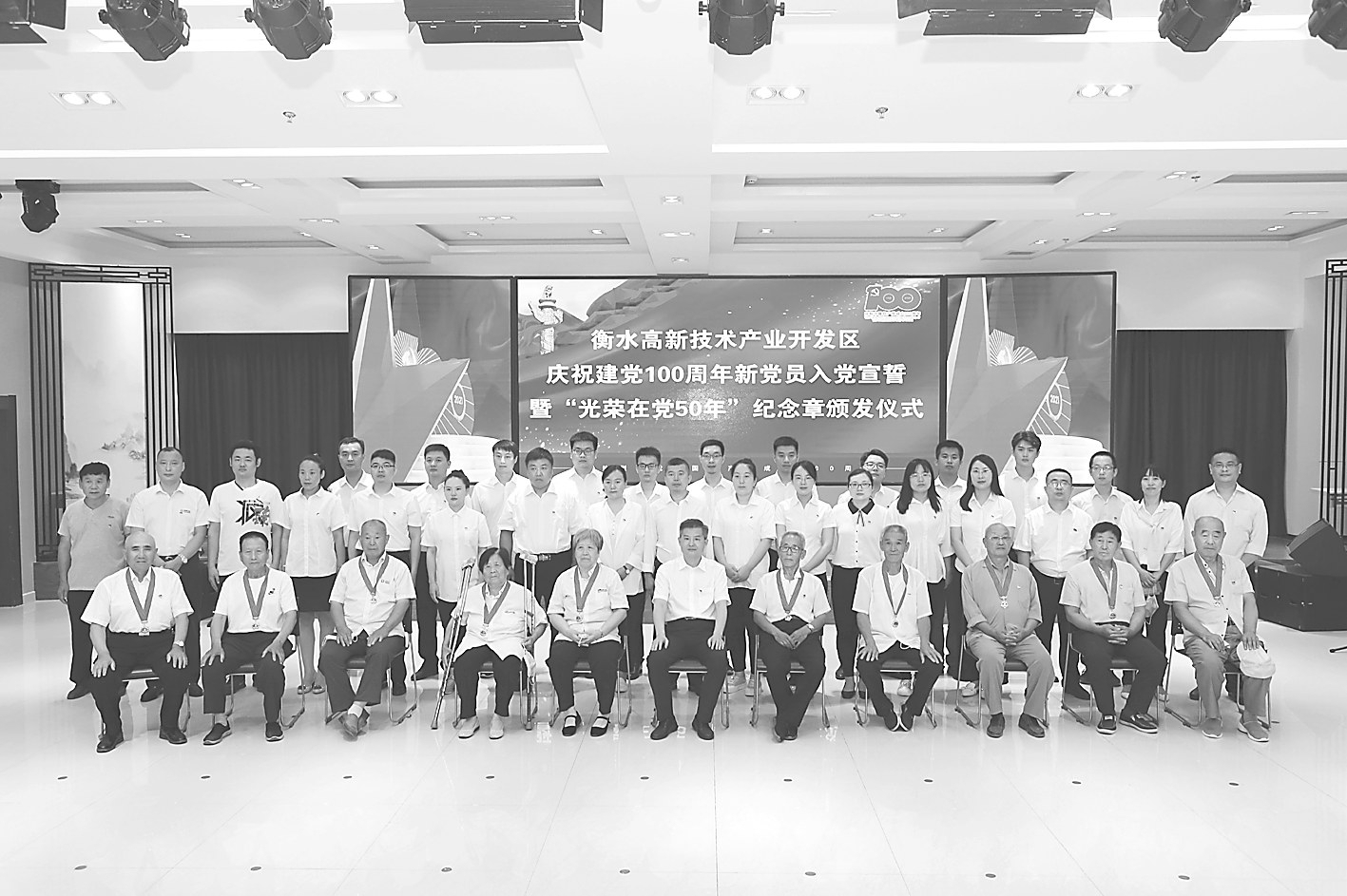 本报讯 (记者 刘凤举 尹鹏举)6月30日上午,衡水高新区在衡橡科技平原枪声展览馆举办庆祝中国共产党成立100周年活动,高新区党工委书记、管委会主任王建明出席活动,带领大家一起重温入党誓词,并为10名老党员代表颁发“光荣在党50年”纪念章。