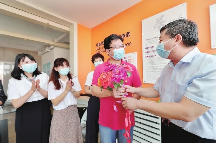 昨日,和平区总工会劳动模范协会组织慰问教育系统劳模教师,为劳模教师献花,并现场办公解决劳模在教学过程中遇到的困难,表达了对辛勤园丁的节日祝福。图为第二南开中学教师蔡培浩(右二)高兴地接过慰问花束。