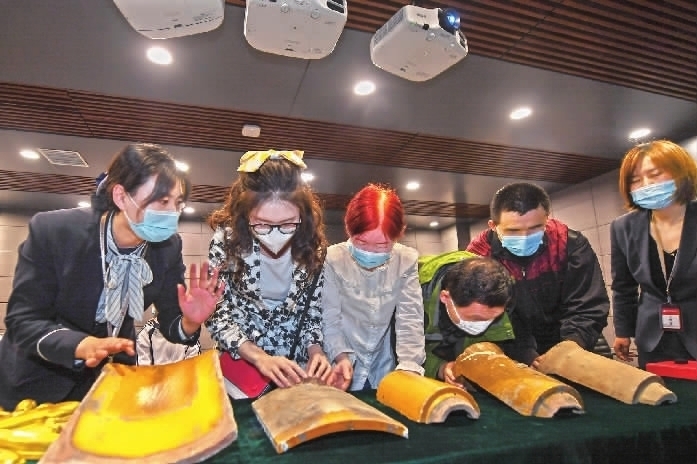 长春大学特教学院20名视障大学生日前来到长春伪满皇宫博物院,以触摸和倾听的方式“参观”博物馆,感受了解历史。图为视障大学生在触摸伪满皇宫建筑上曾使用的零部件。