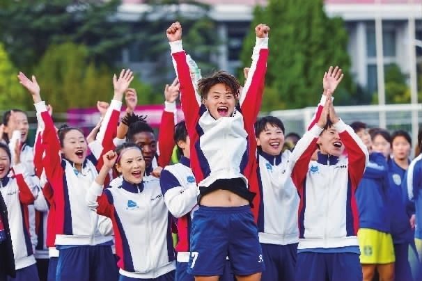 ▲武汉车都江大队球员王霜(前)在颁奖仪式上庆祝。 新华社 发