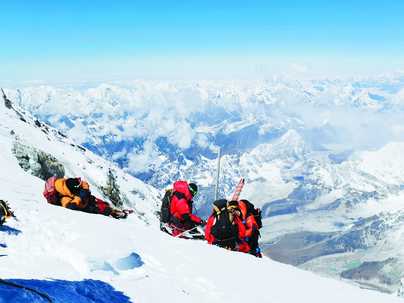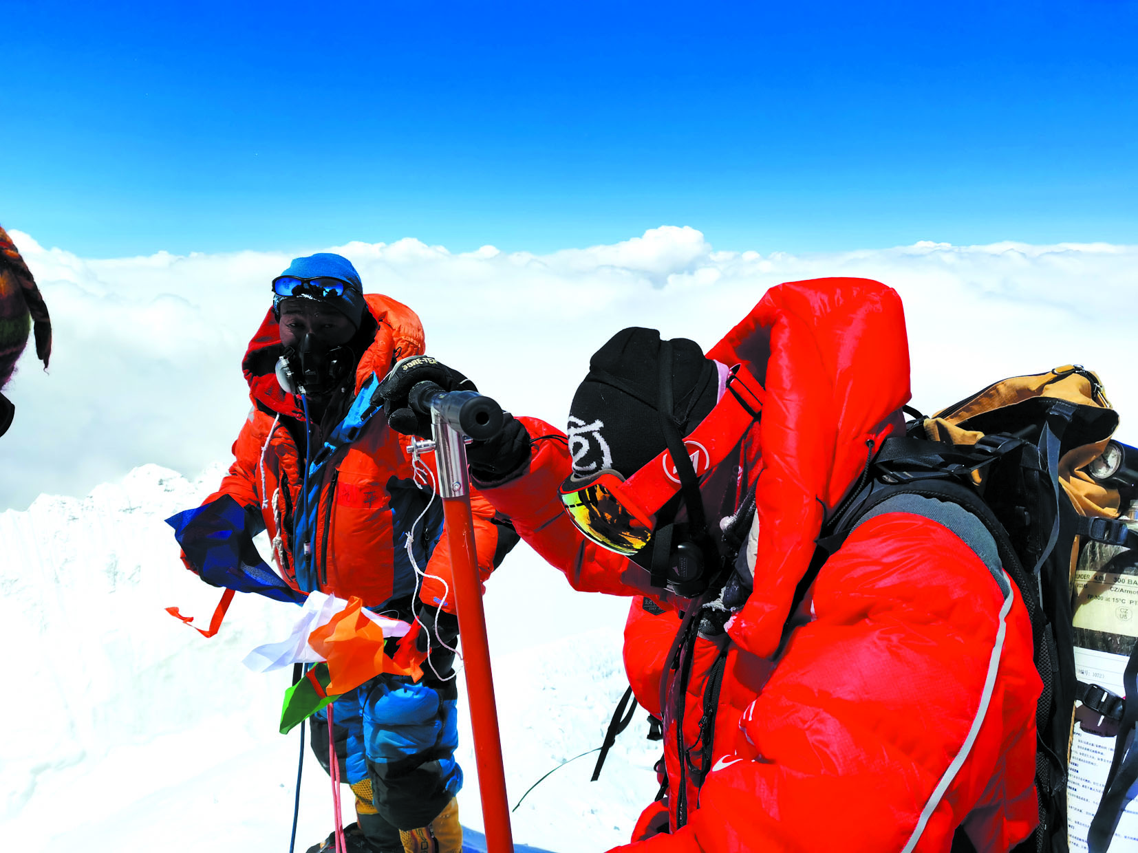 图①:5月4日中午,我国珠峰科考队员成功登顶,并首次利用高精度雷达,测量峰顶冰雪厚度。新华社特约记者 索朗多吉 摄