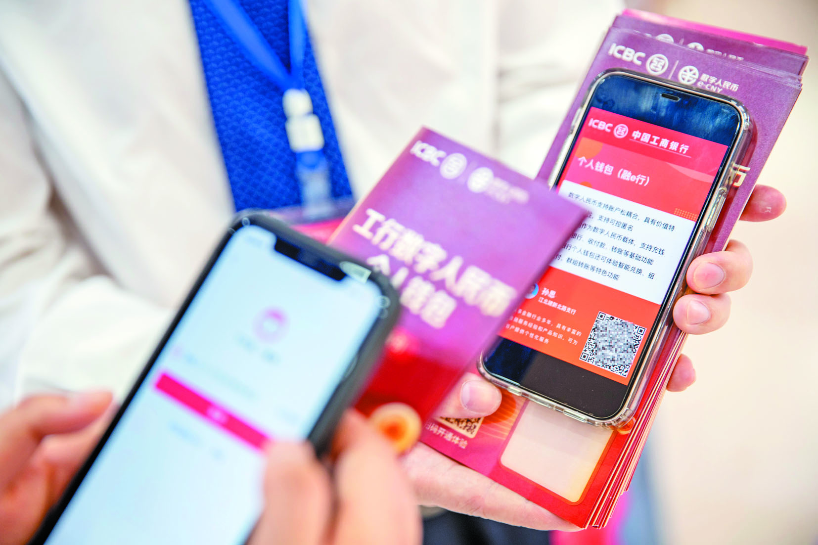 自重庆成为数字人民币第三批试点城市之一以来,中国工商银行重庆市分行围绕数字货币、数字经济不断丰富消费者支付体验,便捷支付方式,助力“五一”小长假消费。图为工行重庆市分行江北建新北路支行工作人员推介数字人民币APP。 新华社记者 黄伟 摄