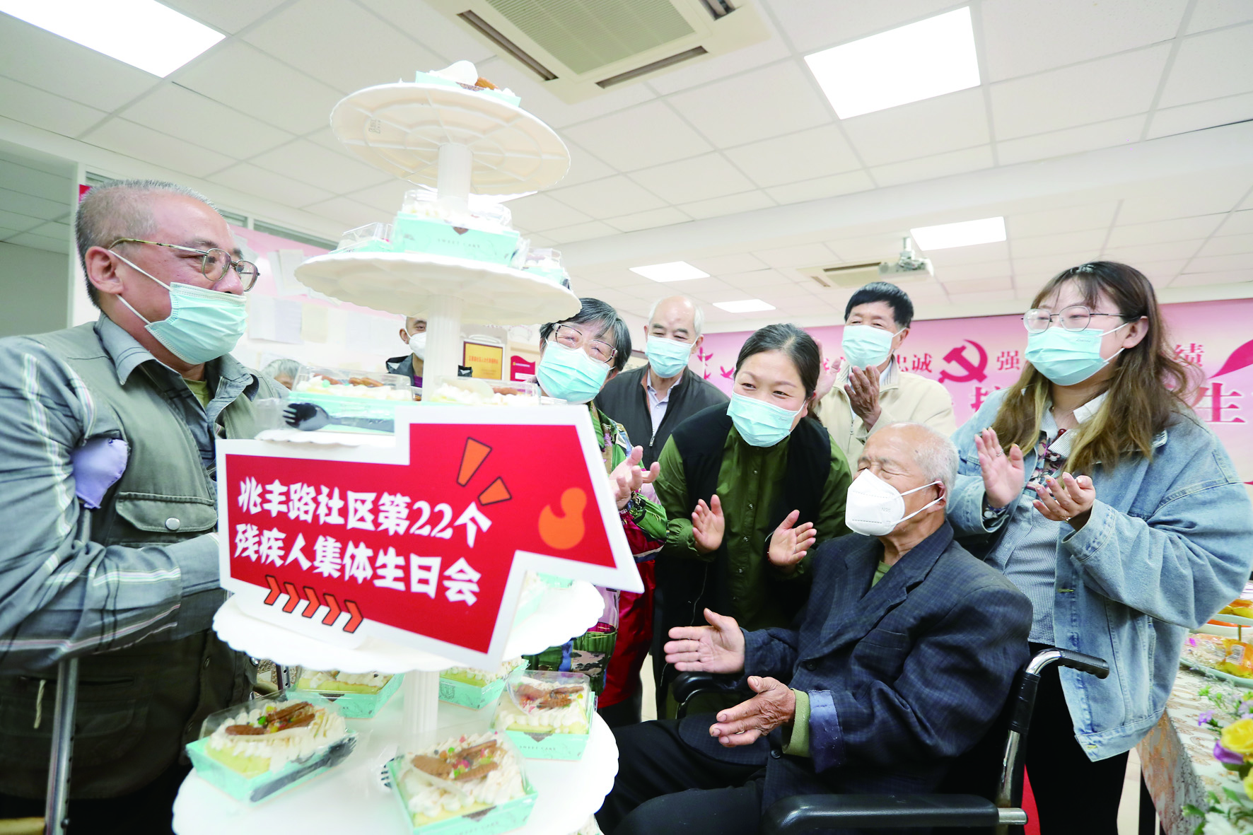 日前,和平区委组织部、区残联、劝业场街在兆丰路社区开展残疾人帮扶志愿活动。图为志愿者为残疾人过生日。沈岳/摄