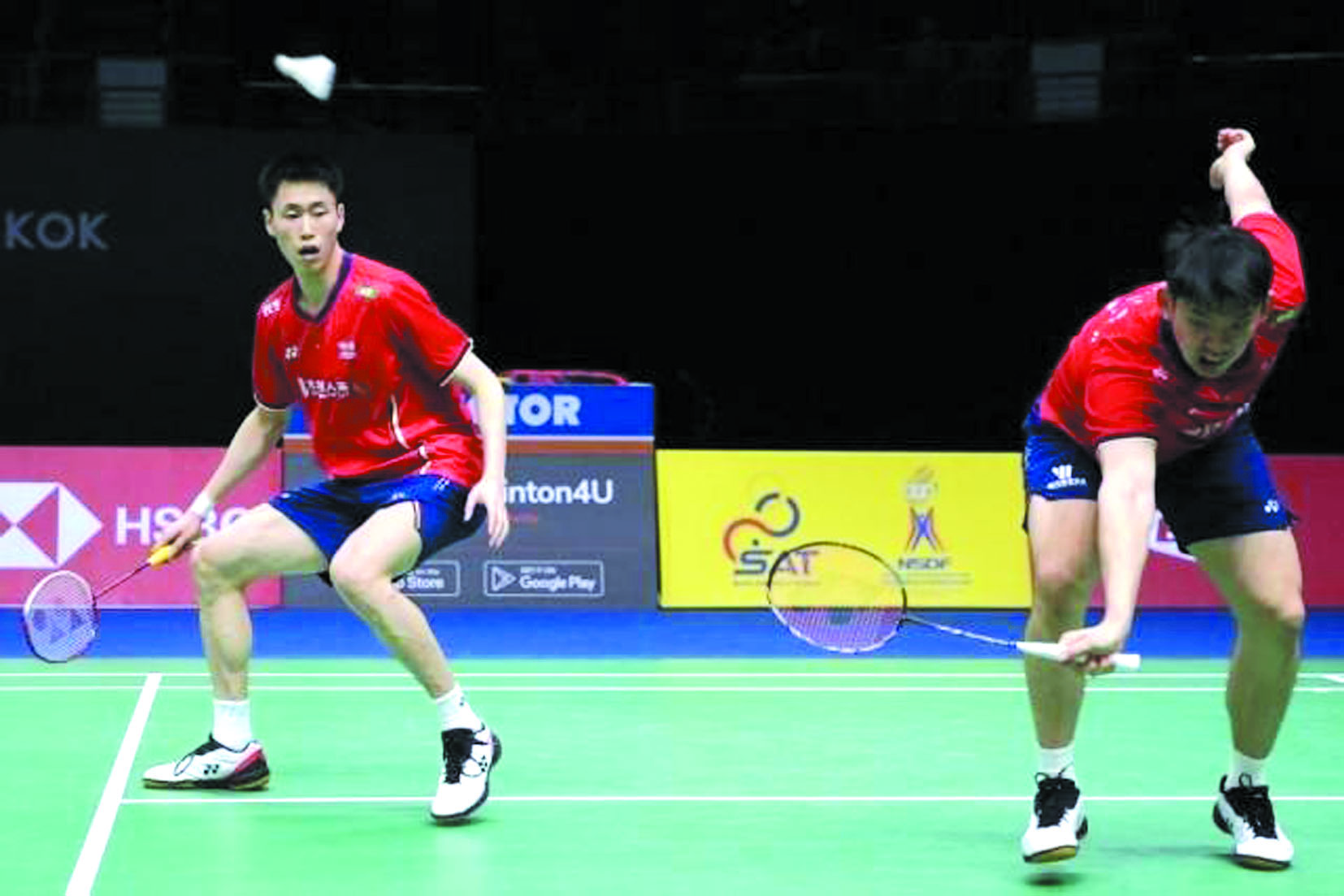 5月12日,中国队组合刘雨辰(右)/欧烜屹在男双比赛中。 新华社记者 王腾 摄