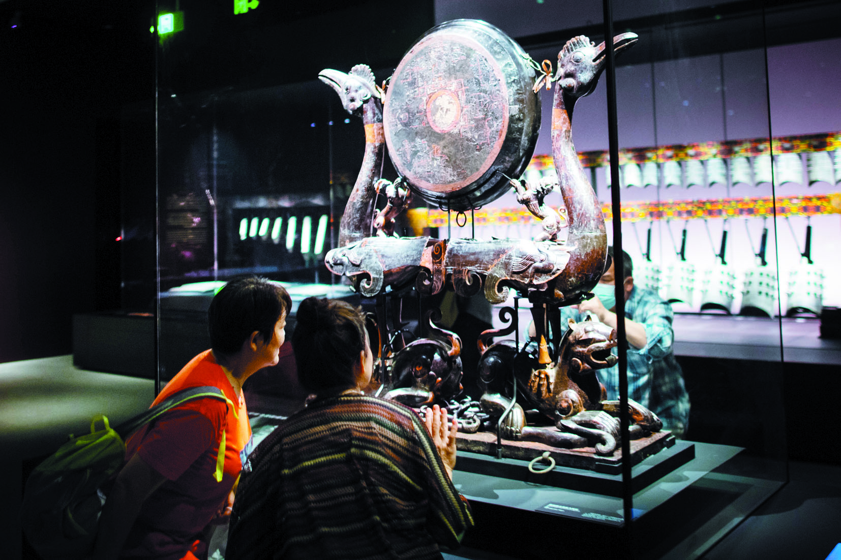 在湖北省博物馆,许多文创产品取材于彩绘漆木虎座鸟架鼓、铜鹿角立鹤、彩漆木雕鸳鸯形盒等以动物为主题元素的文物,深受人们欢迎。图为参观者观看展出的彩绘漆木虎座鸟架鼓。新华社记者 肖艺九 摄