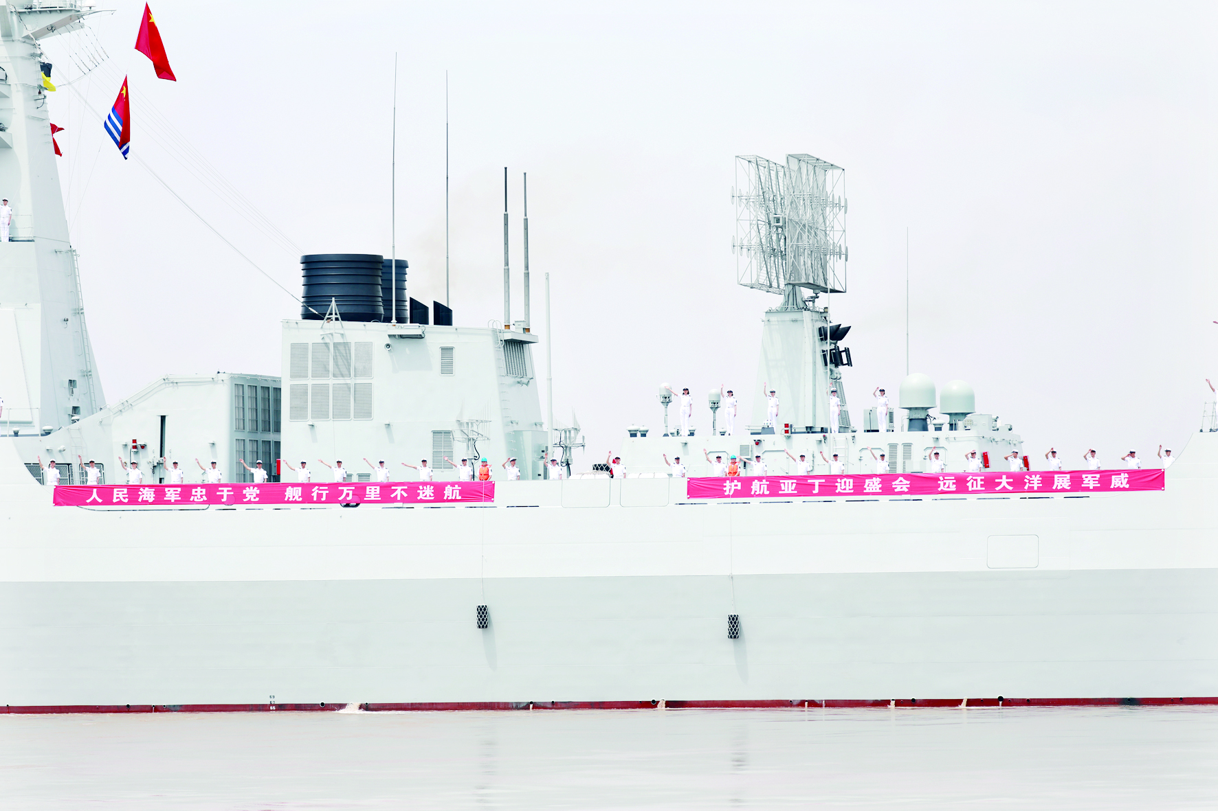 9时许,伴随着嘹亮的军乐声,编队舰艇依次驶离码头。甲板上,任务官兵精神抖擞,整齐列队,挥手告别。