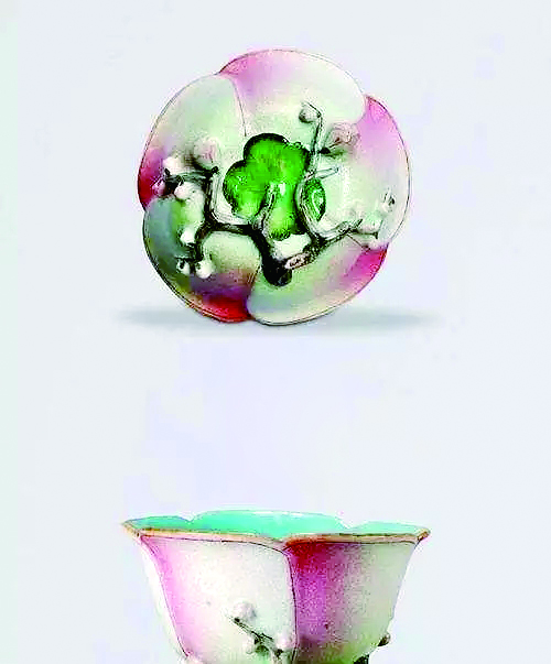 乾隆一朝瓷艺臻至顶峰,十分注重独特的艺术性与奇巧的装饰性,殚精竭智,力求新奇考究,此杯即为此风潮之代表,杯敞口,杯身作玉兰花形,花瓣五片,为仿生花朵之情态,因势象形,层迭而出,器身上丰下收,曲线优美,杯底及一侧有枝叶、花苞相连而出,蜿蜒汇聚而成底足,造型饱满柔和,甚是可人。杯内罩施松石绿釉,外壁以粉彩勾勒,每瓣之上由淡粉而娇黄,以淡雅的色泽自然过渡,更显莹润素洁,婀娜妩媚,令人爱不释手。