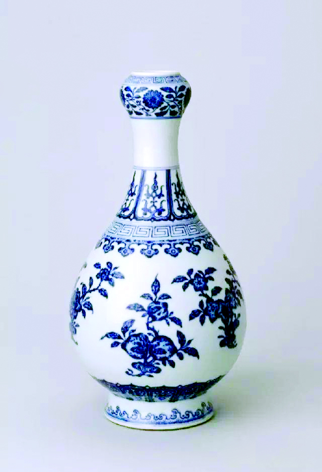 瓶口内敛,呈蒜头状,直颈,溜肩,垂腹,圈足外撇。腹部主题图案绘6组折枝花果纹,辅以回纹、缠枝花卉、如意纹、莲瓣纹及海水纹。纹饰布局疏密有致,青花艳丽,画工精细。足内有青花篆书“大清嘉庆年制”六字款。