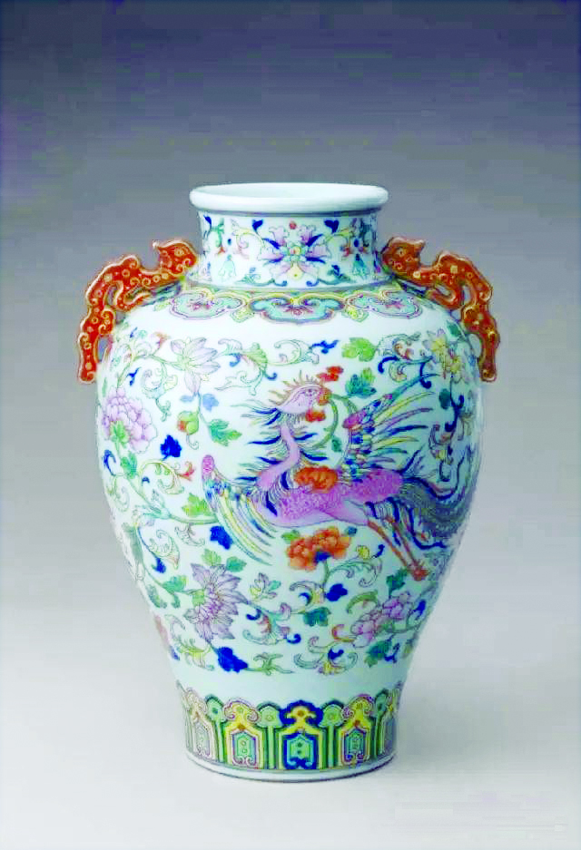 瓶撇口,束颈,长圆腹渐敛,圈足。肩部对称置红釉描金螭龙耳。瓶外壁主体绘粉彩龙凤穿牡丹花纹,以宝相花纹、如意云头纹、变形仰莲瓣纹为边饰。圈足内施白釉,署青花篆书“大清嘉庆年制”三行六字款。