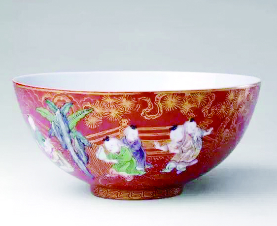 嘉庆朝承袭了乾隆时期的制瓷工艺,此时的景德镇御窑厂继续生产御用瓷器。此碗色彩鲜艳,图饰活泼,红色地更衬托出婴戏图的热闹气氛。