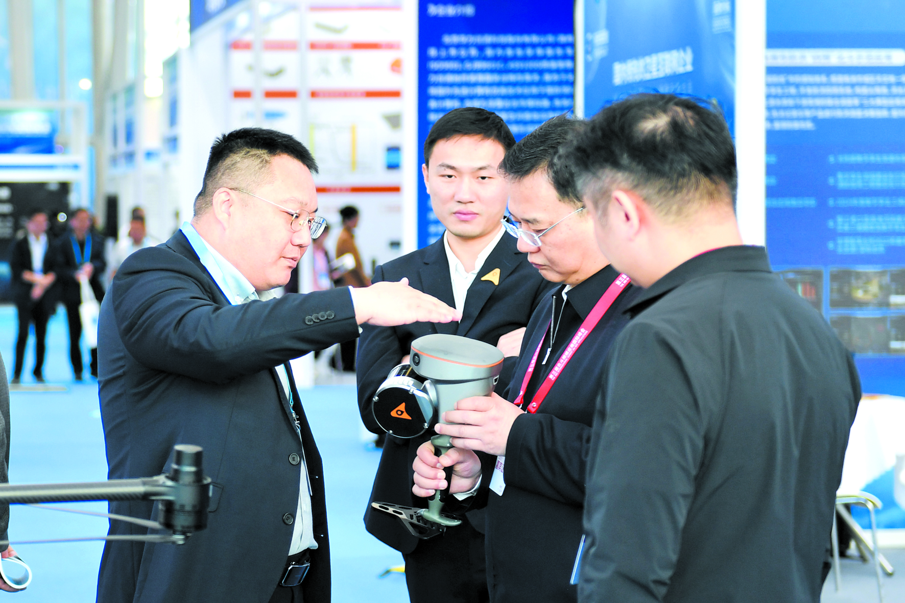 10月24日,第三届北斗规模应用国际峰会在湖南省株洲市开幕。图为参展商在峰会场景示范区向参观者介绍一款智能查险装备。 新华社记者戴斌 摄