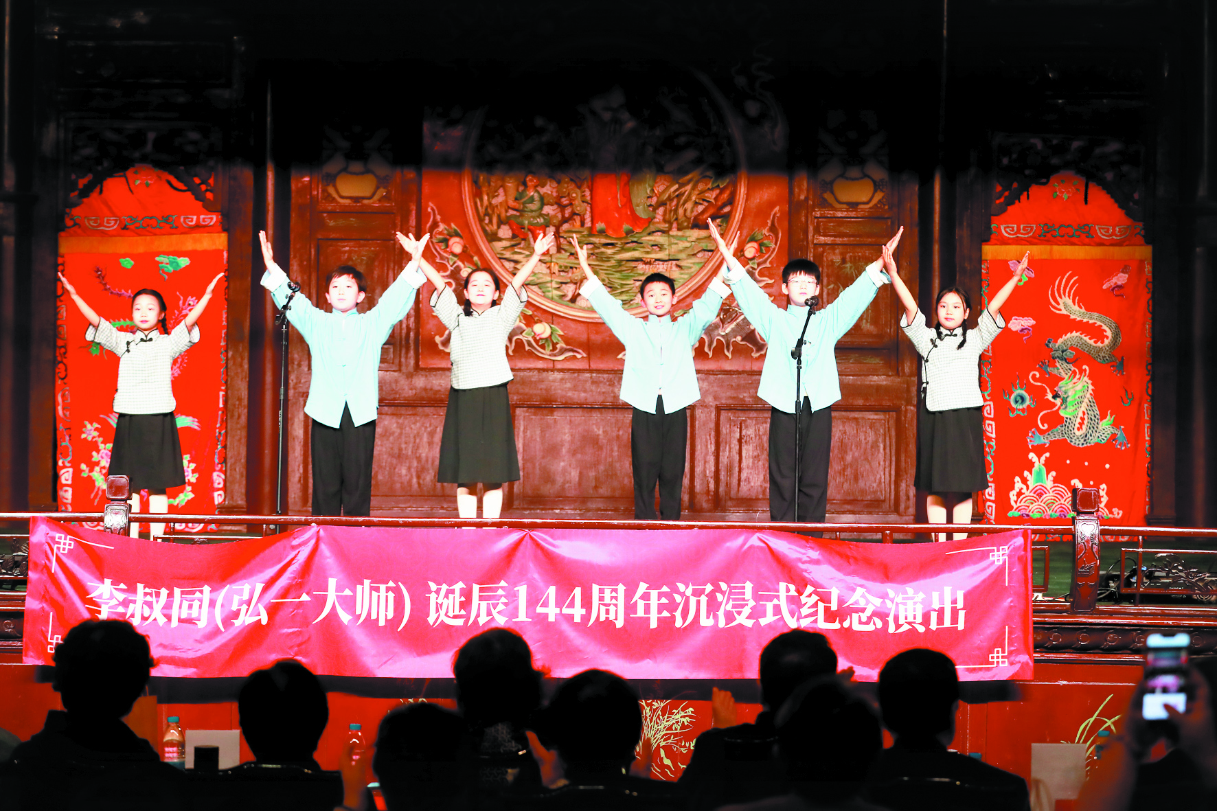 李叔同(弘一大师)诞辰144周年沉浸式纪念演出昨日晚举行,来自和平区青少年宫小白鸽艺术团、天津市美术中学等学校的学生参演。 沈岳 摄