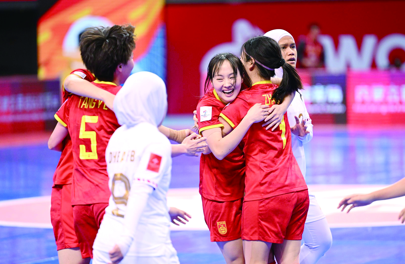 5月13日,在内蒙古呼和浩特市举办的2025年亚足联女子五人制足球亚洲杯四分之一决赛中,中国队6比0战胜印度尼西亚队,晋级四强。图为中国队球员在比赛中庆祝进球。新华社记者贝赫 摄