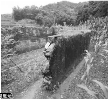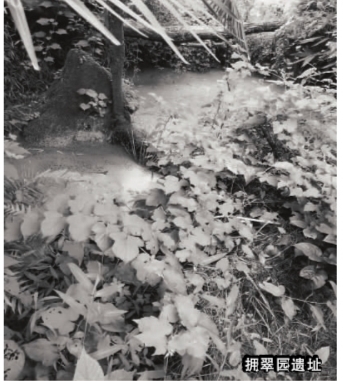 张氏宗祠南面围墙外是稻田,沿田塍往里走,又见几间三沙土残垣断壁,其后竹篱围着一块菜园,菜园后是一堵石驳土,上建有一幢四扇三间的砖瓦屋。邓艺说拥翠园最大看点是有一座巨型天然山石,依山石挖开一口泉池种荷养鱼。但是,粗眼看园中并无山石。山石难道被后人炸掉建了新屋?众人甚是担忧,却不甘心地顺路来到砖瓦屋前。看那藤萝交织、棘灌丛生,极难分辨里面是土还是石。有人想钻进棘灌丛探个究竟,却发现有道深坑。细看那坑,竟然环绕着一座独立巨石。邓艺肯定地说,这巨石就是拥翠园的天然山石。于是,众人又入菜园察看,山石被藤萝棘灌裹得严严实实,辨不甚清轮廓,其下散长着几丛菊,沿山石往前走,拨开杂草,突见一口满布青萍的泉池,泉池中间长着一棵棕树,那树长得怪,似乎先是横着长然后才往上长,横着的那段树杆像是天生桥,将泉池隔成两半,一大一小,水却相通。找到了天然山石,又找到了泉池,这里肯定就是拥翠园之所在,那些残垣断壁无疑是南屏书院遗址。众人又是一阵兴奋。