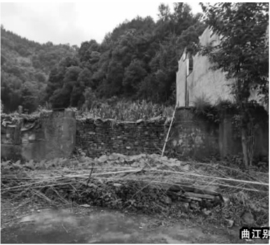 但是,此行主要目的是寻找拥翠园遗址,追寻当年的风流。邓艺说拥翠园在张氏宗祠旁边,得去那里寻找。张氏宗祠在环溪村西头,书宝岭下,近年经过修建,外看似新。然而在其西墙外,却保存着几堵残垣断壁,皆三沙土筑成。众人走进去察看,残垣断壁面宽三直,中有庭园,貌似四合小院。邓艺见过《环溪张氏族谱》的祠堂图,肯定地说:这就是曲江别墅遗址,别墅后空地就是依绿园,曲江之名是源自对张氏先祖张九龄的景仰。当年的文事雅集,很多来客就是下榻曲江别墅。