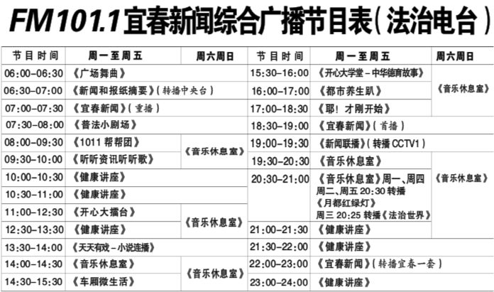 FM101.1宜春新闻综合广播节目表(法治电台)