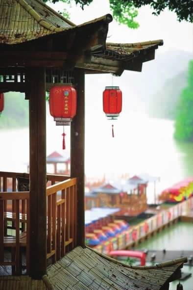 有诗为证:九曲山庄座岭中,围龙古屋展新容。竹楼简朴镶金玉,场馆珠辉绕绿从。戏浪驾舟男女勇,弯弓跑马壮青雄。养生湖里翁妪乐,百鸟鸣春童稚拥。健康产品延年寿,世外桃源逸兴浓。