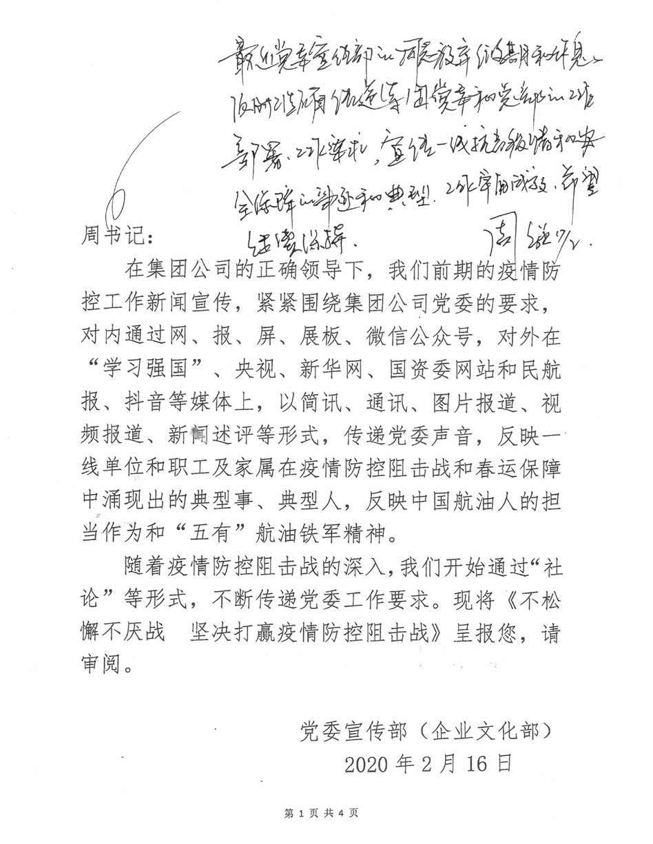 周强在2月17日社论《不松懈不厌战 坚决打赢疫情防控阻击战》的批示中写到:最近,党委宣传部的同志放弃假期和休息,及时准确传递集团党委和总部的工作部署、工作要求,宣传一线抗击疫情和安全保障的事迹典型,工作卓有成效,希望继续保持。