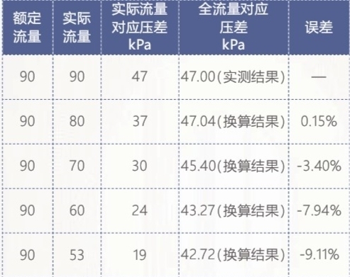 从表3的数据中可以看出,当实际流量与额定流量比较接近时,软件换算的全流量对应压差与实际压差的结果差别不大,在流量为80立方米/小时换算误差仅为0.15%,当实际流量与额定流量相差较大时,软件换算的全流量对应压差与实际压差的结果有一定差异,在实际流量为53立方米/小时时误差达到-9.11%。