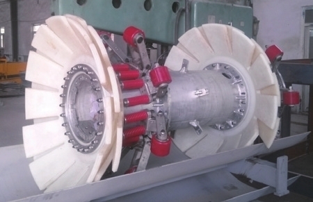 为保证变径皮碗稳定的密封性能,设计了开槽全密封变径皮碗密封装置。在开槽变径皮碗基础上修改皮碗分瓣处的间隔块模具,将12个间隔块模具打薄5毫米,这样原来通透的间隔槽处就留有5毫米厚一层聚氨酯薄层,提升密封性能。图4中下面的2个皮碗为开槽变径皮碗的情况,开瓣处通透,漏气量较大;图4中上面的2个皮碗为改造后的开槽全密封变径皮碗装置情况,开瓣处留有5毫米聚氨酯层,保障整个皮碗外表面是全密封状态,而且薄层处也易于在40″管道中的变形。