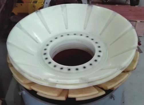 该变径皮碗周向上由前后各12个皮碗块交错布置而成,该结构皮碗贴合紧密,单个皮碗块模具简单,易于制造(图2),加工完成后,将变径皮碗组装在变径检测设备的驱动节中(图3)。