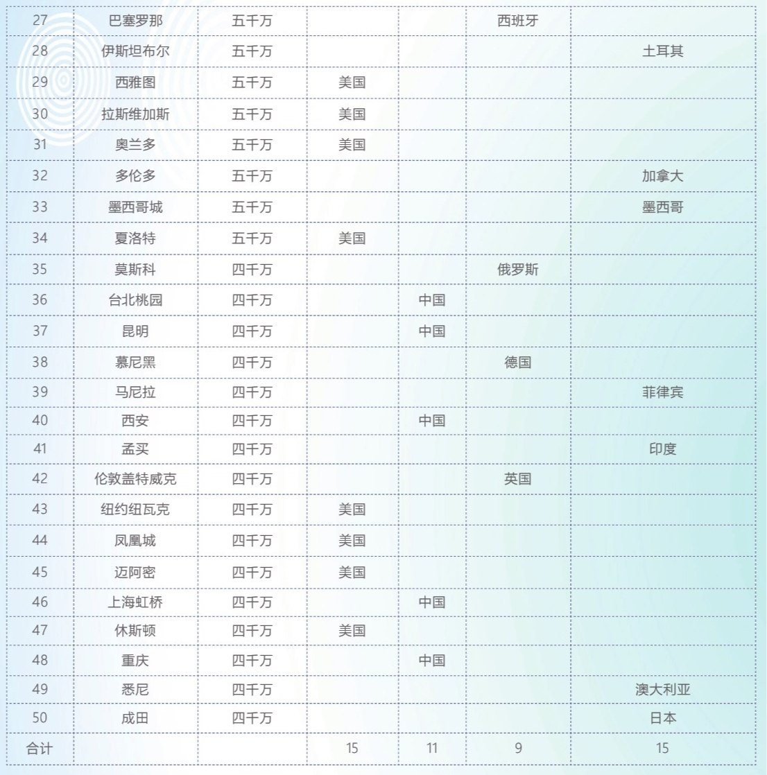 从表2可以看出,全球旅客吞吐量排名前50名的机场中,美国占15个,中国占11个,欧洲占9个,其他区域国家15个。美国和中国合计26个,超过50%,是名副其实的两个超级航空大国。中国杭州萧山机场2019年旅客吞吐量超过4000万,接近前50名。
