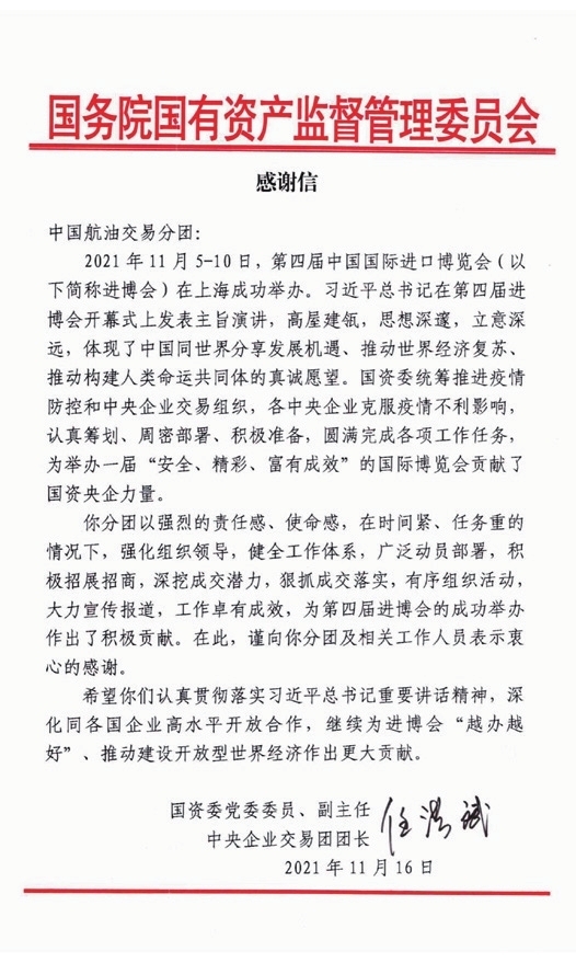 11月21日,集团公司收到国务院国资委感谢信。来信对中国航油在第四届中国国际进口博览会期间,作为民航的重要保障单位,严格按照“绝对保障、万无一失”的目标要求,切实履行中央企业责任,从严从实从细抓好安全稳定和服务保障工作表示感谢。