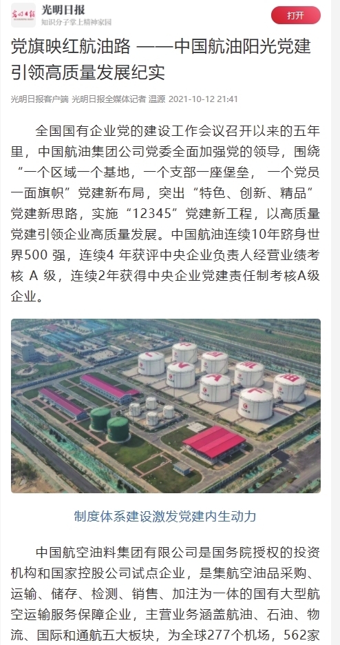 “十三五”以来,中国航油集团公司党委秉承国有企业的红色基因,坚持国企姓党、航油姓党,立足新时代,打造新党建,体现新特色,形成高质量党建引领企业高质量发展的新格局。