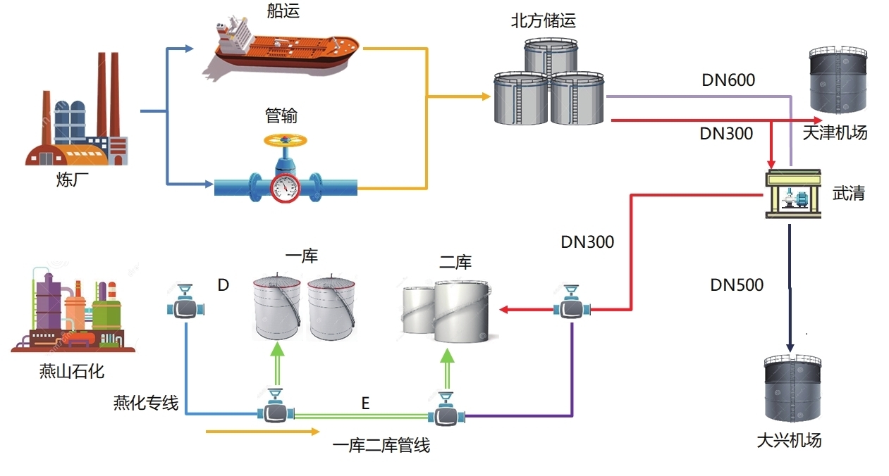 实际上,在输往第二油库的津京输油管道上,武清泵站涉及向大兴机场输油、首都机场二库输油两条分支,如图2所示。