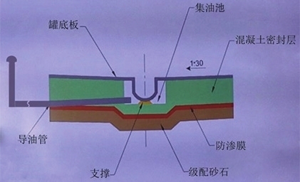 这种方式最大的优点是可以将油罐底板以下、筏板以上、环墙以内的水分排干,保持油罐底板以下有干燥的环境,能够大大降低油罐底板腐蚀速度,避免底板腐蚀穿孔风险。缺点是日常检查不方便,井盖台重,不易搬动,往往被忽视检查,另一方面,若油罐底板腐蚀穿孔,漏出的油品需要穿过1米多的回填层,并汇集到一定的量,但不需要达到一定的高度,流出时才被发现有油,发现罐底渗漏需要一定的时间。因此各国都在优化该调整检测方案。