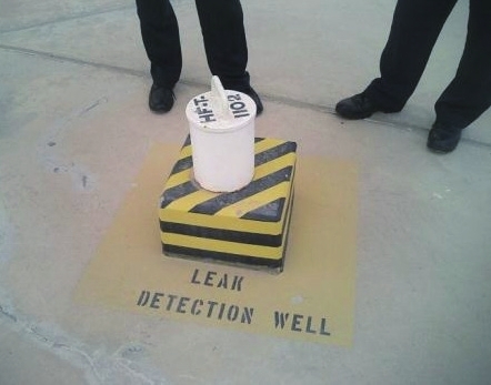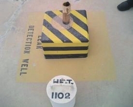 正如前文讲的,国内外在此方面的起步基本相同,国内参考了国外的做法。随着时间推移,认识不断提高,国外在不抬高环墙的前提下,巧妙地运用了U形管原理和虹吸原理,采取了U形管的面状收集检测形式[4]、[5]。罐底钢板位于混凝土垫层之上,在混凝土垫层之下敷设防渗膜,罐底板沉淀槽下部设置了混凝土密封集油池,不论罐底何处渗漏,均被防渗膜隔离,并沿着锥面,汇集到集油池,收集的渗漏油品将顺着一根U形导油管流出,渗漏检测原理如图4-1。油罐外侧边缘设一个检查口,检查口由三部分构成,约DN50的立管伸出地坪,相当于检查井的井壁,与自集油池出来的管子相通,立管内有一根约DN10可以取出的pvc小管,可以通过虹吸现象检查罐底是否有泄露,此外还有一个有一定重量的金属检查井冒,不检查时将其盖在检查口上,防止刮风及雨水进入(如图4-2、图4-3)。