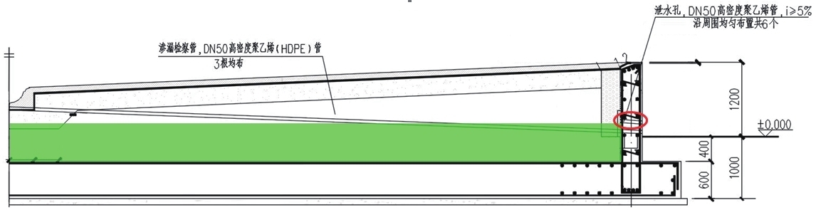 但缺点也很明显:第一,更广的非花管区域的渗漏不能被及时发现,只有将环墙内部容积渗满、达到排水口的高度时,充满图5-1绿色区域后,渗漏的油品才会从排水口(如图5-1,红色圈出)排出,检查时才会被发现。以5000立方米油罐为例[6],绿色区域的容积约为131.88立方米,在筏板、环墙密封不漏的前提下,渗漏的油品将这131.88立方米的空间浸泡饱和后,方能沿检查口流出被发现,而20000立方米油罐[2]则需将约1070立方米的空间浸泡饱和后,方能被发现。国内某航油库出现过类似的案例。